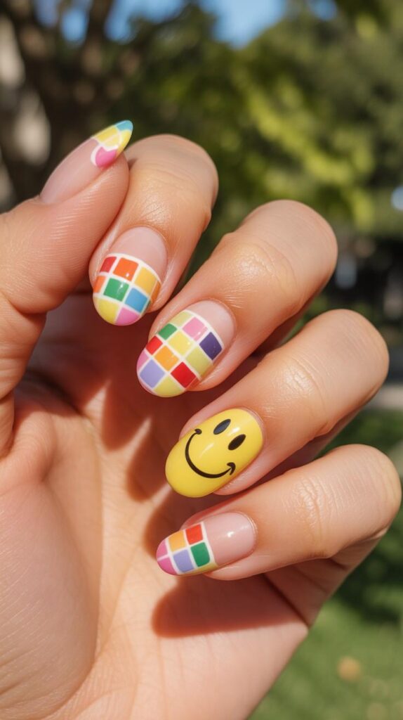 Short squoval nails in sheer nude base, two accent fingers showcasing colorful checkerboard grids (red, yellow, blue, green, purple) and one with a cheerful hand-painted yellow smiley face. The glossy finish unifies the palette, and the compact shape ensures durability through real life. Playful, nostalgic, and full of pure delight.