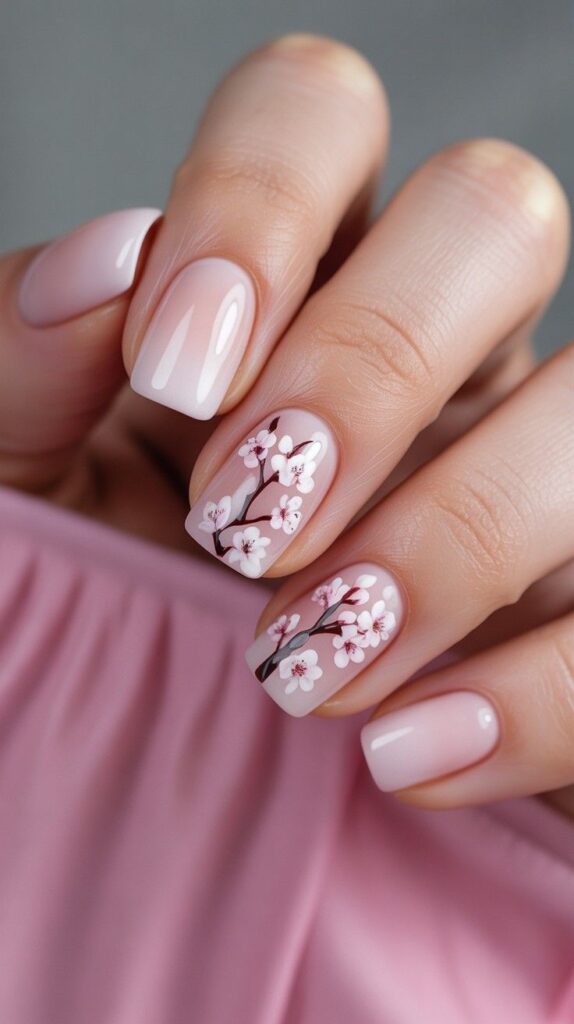 Sheer nude-pink short almond nails adorned with hand-painted pink cherry blossoms on slender dark branches—soft watercolor washes, subtle depth, and gentle romance. The glossy finish enhances the dreaminess, and the elongated shape flatters every hand. Poetic, timeless, and deeply feminine.