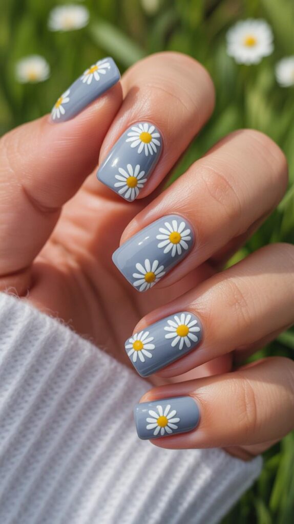 Glossy almond-shaped nails in soft dusty blue, adorned with scattered hand-painted white daisies (yellow centers) and fine green vine details. The high-shine finish enhances the freshness, and the elongated shape flatters every hand. Serene, sweet, and full of springtime rhythm—like a meadow in miniature.