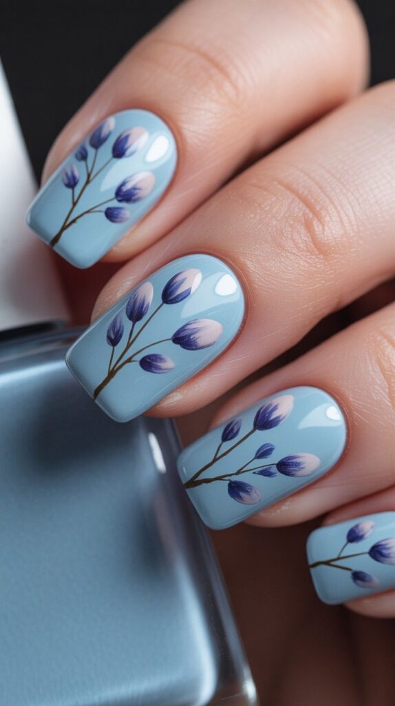Glossy short square nails in soft sky-blue, two accent fingers featuring hand-painted purple-and-white flower buds on fine brown stems—delicate, poetic, and full of quiet movement. The high-shine finish enhances the luminosity, and the crisp square shape ensures modern elegance. Like a meadow in miniature, worn with intention.