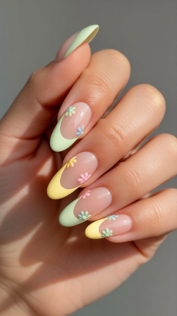 Glossy almond-shaped nails in soft mint-to-yellow ombré French tips, two accent fingers adorned with hand-painted mini daisies in pink, blue, and white. The high-shine finish enhances the sweetness, and the elongated shape adds elegance to the playfulness. Like a candy garden—joyful, delicate, and utterly charming.