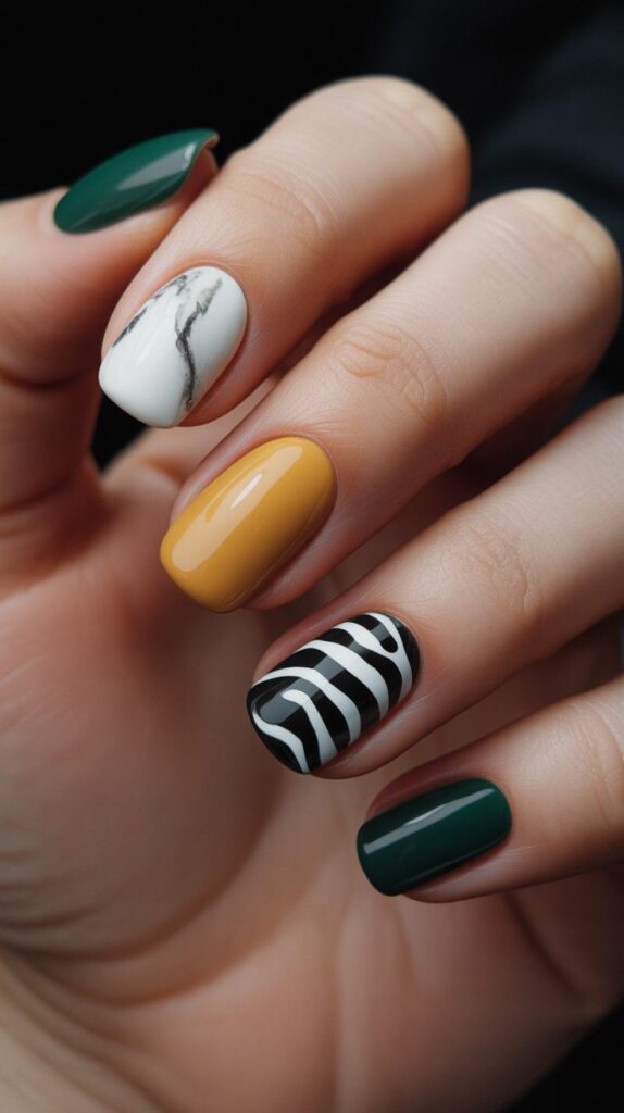 Glossy short almond nails in a bold mix: emerald green solids, white marble with black veining, mustard-yellow solids, and black-and-white zebra stripes—each nail uniquely expressive. The high-shine finish ties the chaos together, and the elongated shape adds cohesion. Not matchy-matchy—harmoniously wild.