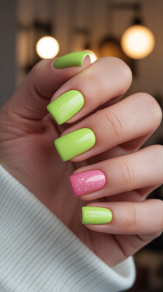 Vibrant glossy lime-green short almond nails, one accent finger in sparkling pink glitter with fine iridescent flecks. The high-shine finish unifies the look, and the compact shape keeps it surprisingly wearable. Joy, layered in light—bold but balanced.