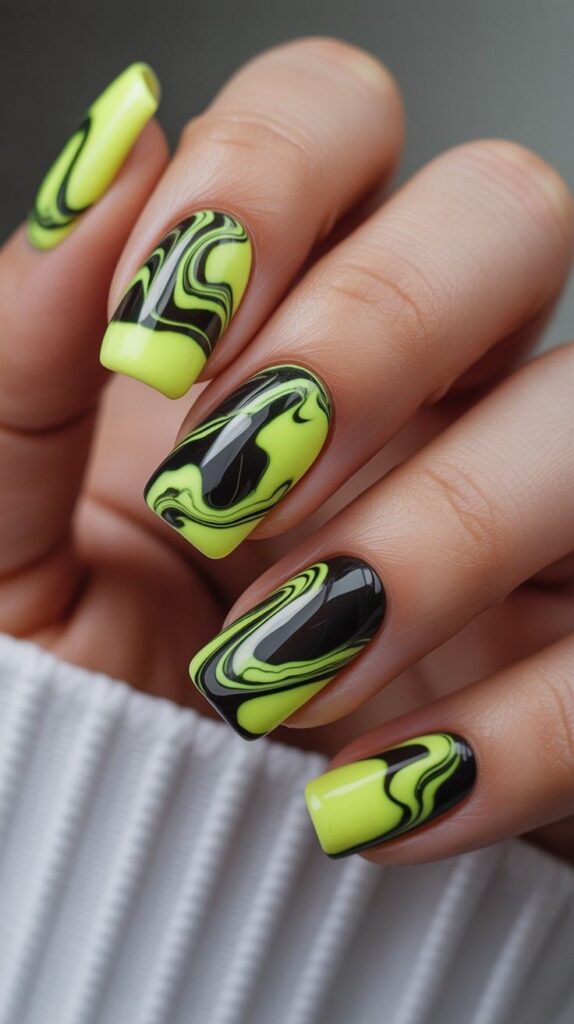 Glossy long stiletto nails in high-contrast neon lime-green and jet-black marbled swirls—fluid, dynamic, and full of electric energy. The high-shine finish makes the colors vibrate, and the sharp shape commands attention. Not edgy—joyfully bold.