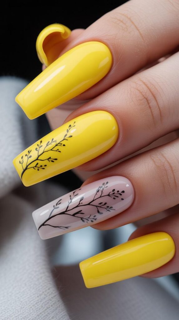 Vibrant glossy lemon-yellow long stiletto nails, two accent fingers featuring delicate black line-art leafy vines and micro-dots. The high-shine finish makes the color radiate, and the sharp shape commands presence. Not loud—just radiantly confident.