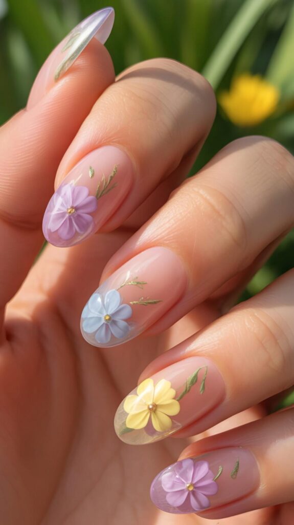 Glossy almond-shaped nails in sheer nude base, each featuring a delicate 3D pressed flower (lavender, sky-blue, lemon-yellow) with gold-center detail and fine green stem accents. The high-shine topcoat seals the botanicals like dewdrops, and the elongated shape enhances the ethereal elegance. Like spring captured in resin—tender, timeless, and deeply poetic.