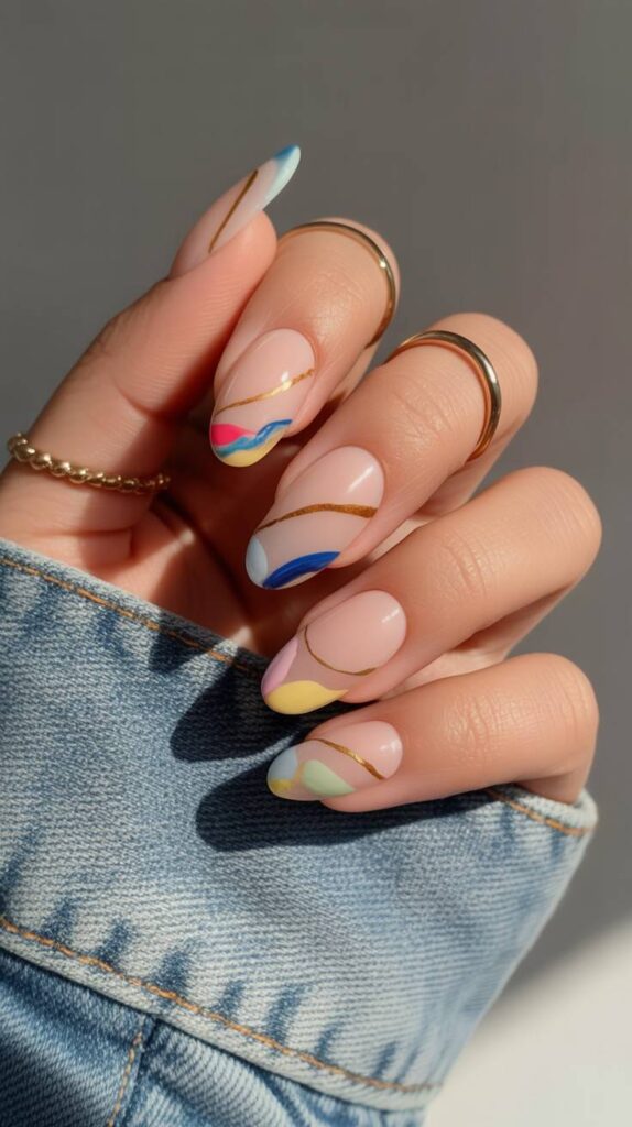 Sheer nude-pink almond nails featuring fluid pastel waves in coral, mint, and sky-blue, accented with delicate gold metallic line art and micro-dots. The high-shine finish makes the colors glow, and the elongated shape adds modern elegance. Whimsical, artistic, and deeply intentional—like a mood board made wearable.