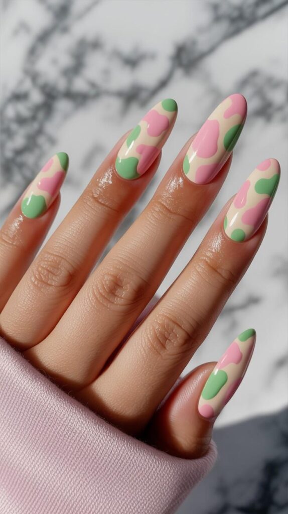 Glossy almond-shaped nails in creamy nude base, featuring playful pink-and-mint green abstract “cow print” splotches—soft, modern, and full of cheerful rhythm. The high-shine finish enhances the dimension, and the elongated shape keeps it chic, not childish. Whimsical, confident, and deeply joyful.