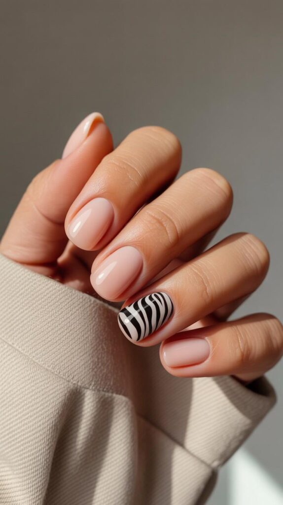 Sheer nude-pink short square nails, one accent finger featuring bold black-and-white zebra stripes—clean, graphic, and full of confident contrast. The high-shine finish sharpens the lines, and the crisp square shape ensures modern sophistication. Minimalist fun, with attitude.