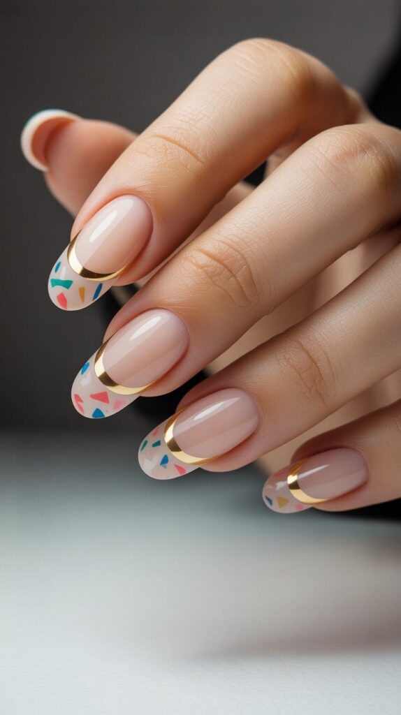 Glossy short almond nails in sheer nude base with crisp white French tips, two accent fingers featuring scattered pastel confetti (teal, coral, mint, gold) and delicate gold metallic trim along the free edge. The high-shine finish enhances the sparkle, and the compact shape ensures all-day wearability. Celebratory, chic, and full of joyful detail—like birthday confetti, worn with grace.