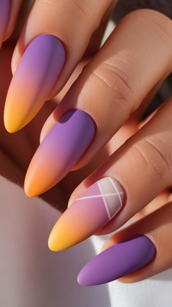 Matte-finish stiletto nails in seamless gradient from lilac → peach → golden-orange, one accent finger featuring a crisp white geometric grid overlay. The satin texture adds modern depth, and the elongated shape enhances drama without fragility. Bold yet balanced—confidence, rendered in color and line.
