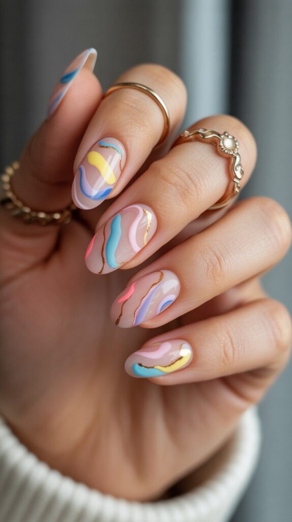 Glossy short almond nails in soft blush base, two accent fingers featuring fluid pastel swirls (mint, peach, lavender) with delicate gold metallic veins and micro-beads. The high-shine finish makes the colors glow, and the compact shape ensures durability through typing or holding coffee. Serene, joyful, and full of gentle movement.