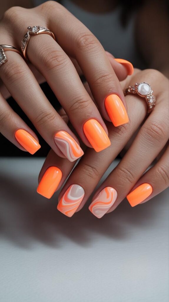 Vibrant glossy coral short square nails, one accent finger featuring a creamy nude base with soft orange-and-white marbled swirls and a tiny gold dot. The high-shine finish enhances the contrast, and the crisp square shape ensures elegance and wearability. Warm, radiant, and deeply cohesive—like sunset light, captured in polish.