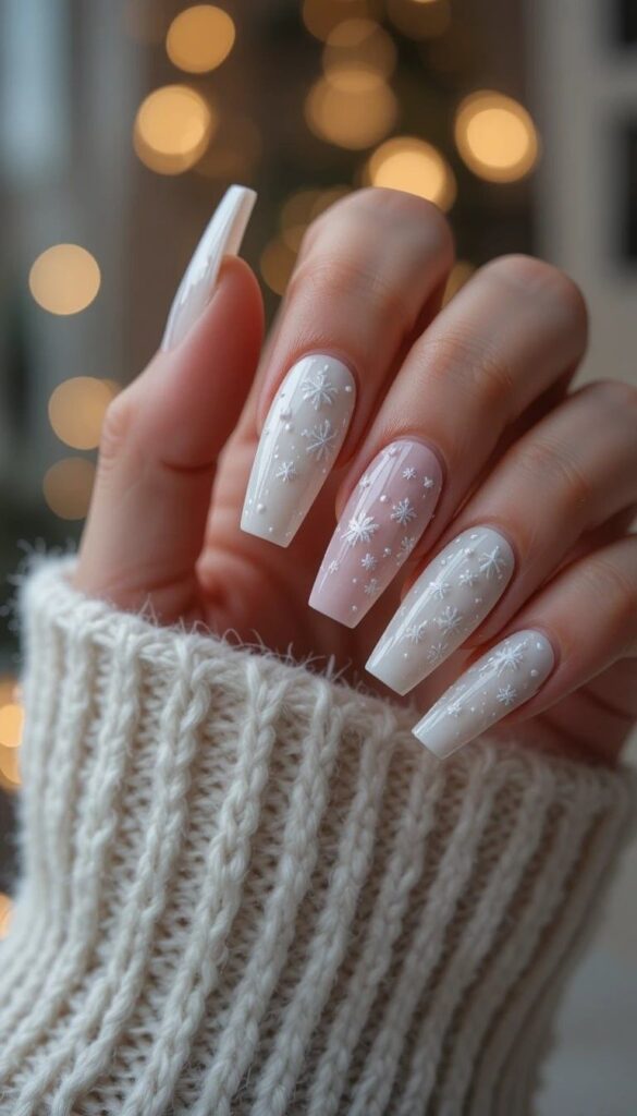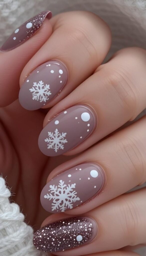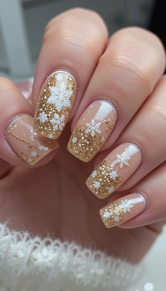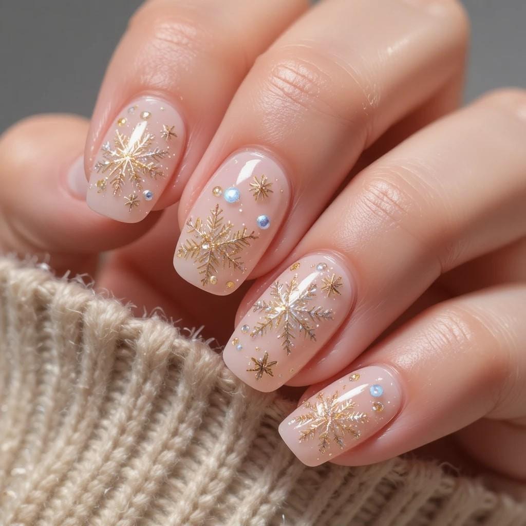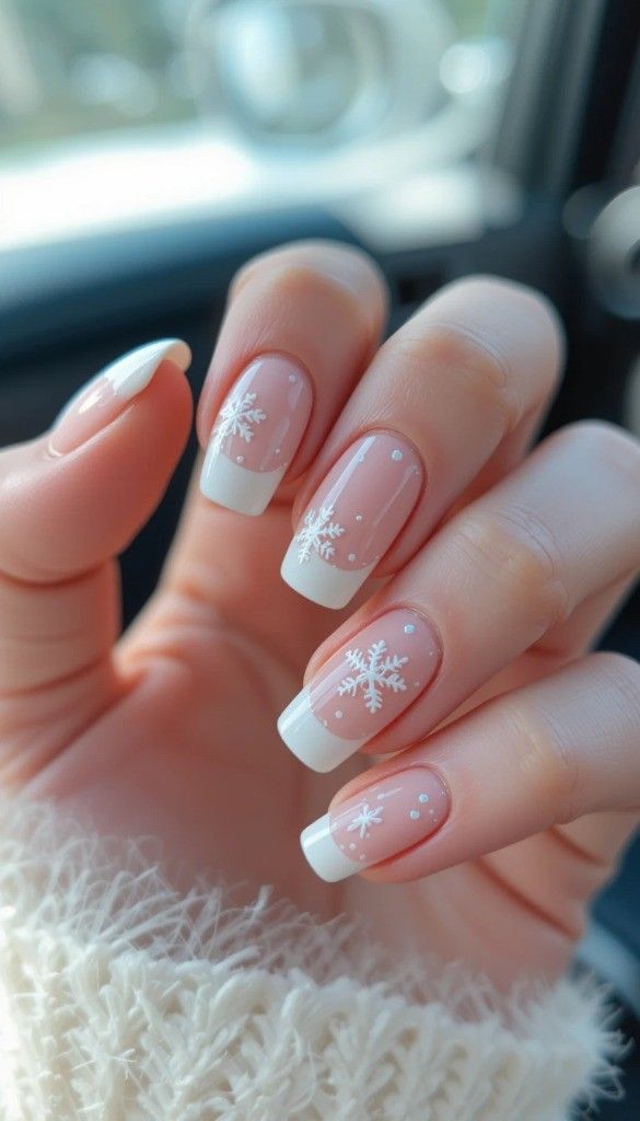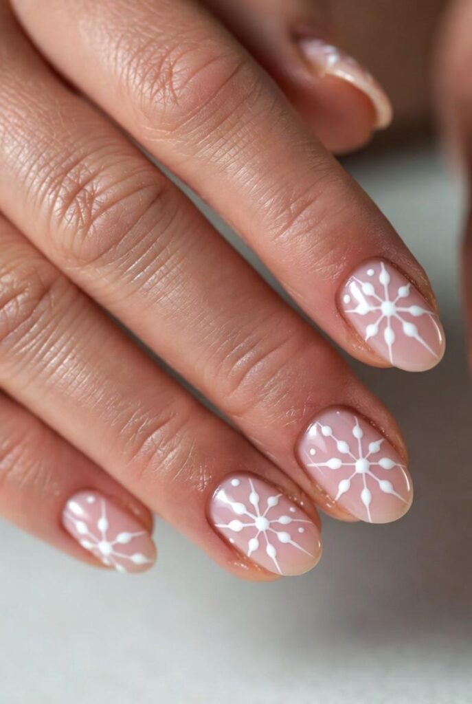 Soft nude nails feature delicate white snowflakes, paired with tiny white dots for extra sparkle. The glossy finish enhances the clean lines and festive charm.