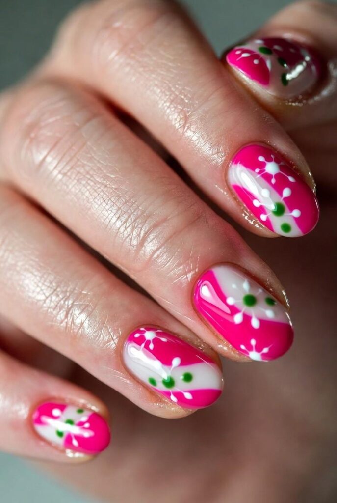 Rich pink nails feature large white snowflakes, paired with one accent nail showcasing bold green stripes. The glossy finish enhances the clean lines and festive energy.
