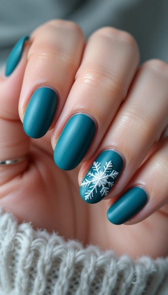 Rich teal nails feature large white snowflakes, creating a clean, elegant look. The glossy finish enhances the dimensional elements and festive energy.