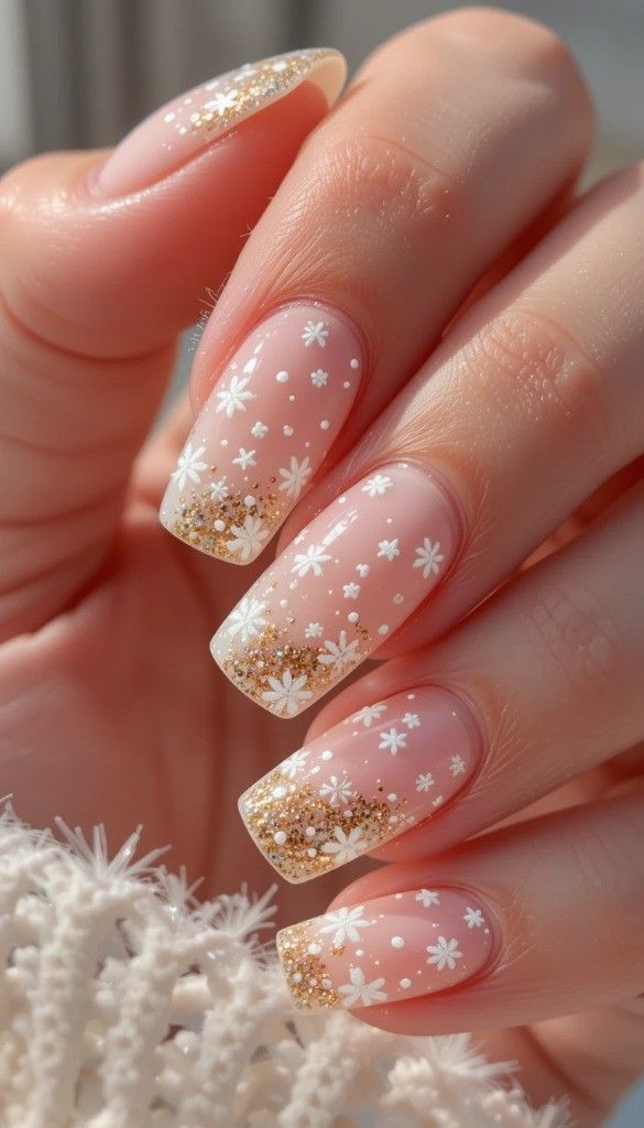 Soft pink nails feature large white snowflakes, paired with one accent nail showcasing a glittery gold base. The glossy finish enhances the dimensional elements and festive energy.
