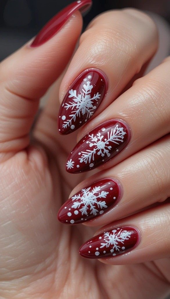 Rich red nails feature large white snowflakes, creating a clean, elegant look. The glossy finish enhances the dimensional elements and festive energy.