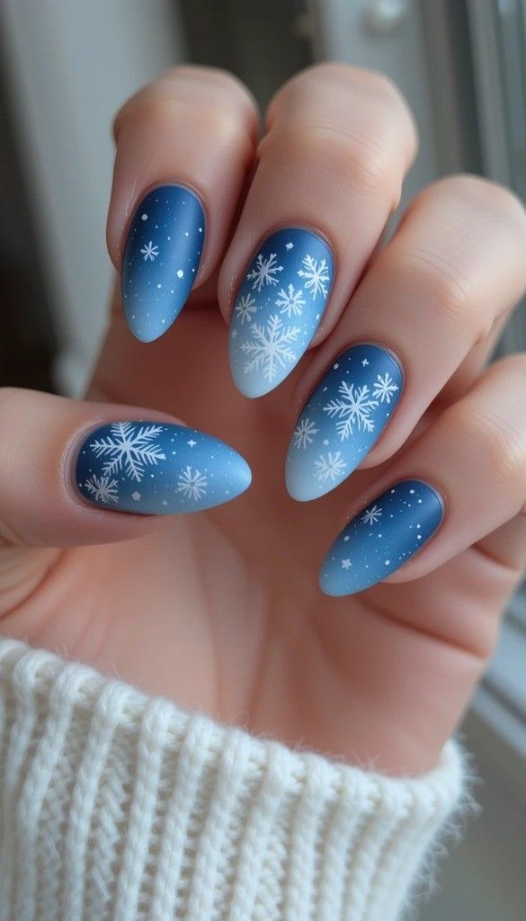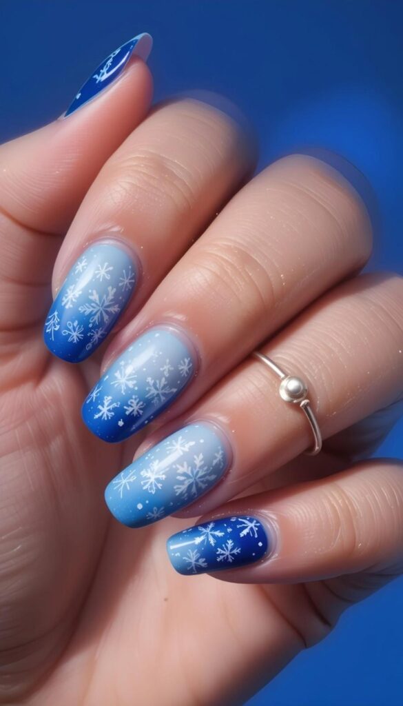 Rich blue nails feature a soft ombre effect, paired with large white snowflakes. The glossy finish enhances the dimensional elements and festive energy.