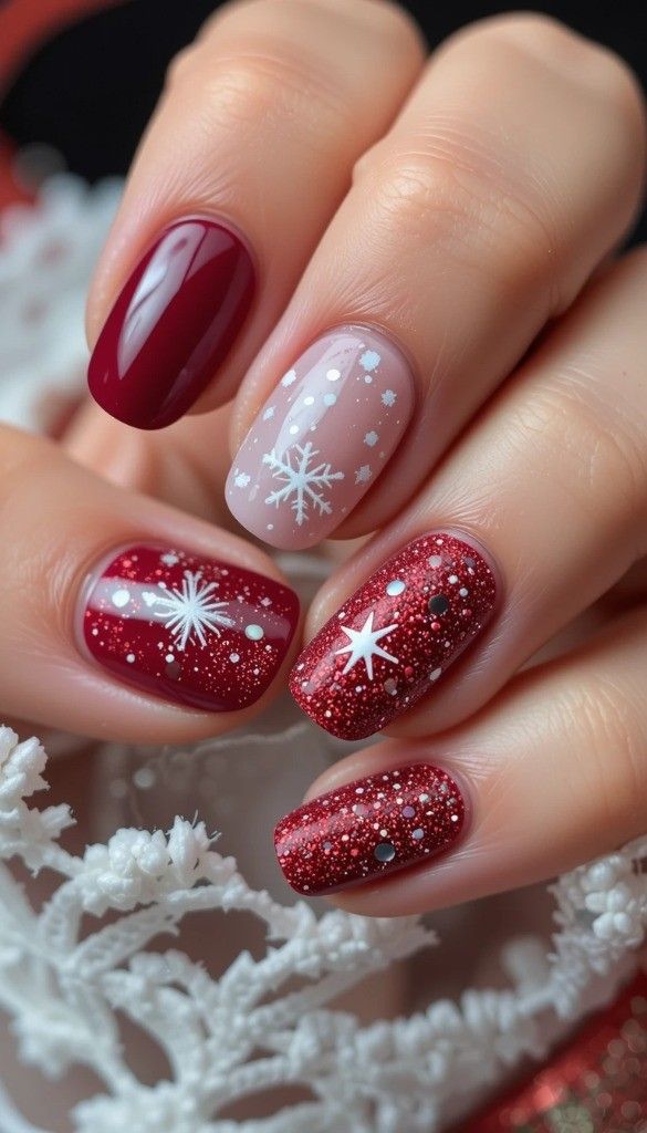 Snowflakes aren’t just a pattern — they’re a feeling. ❄️ In 2025, snowflake nail art is all about delicate beauty, festive charm, and timeless elegance. Think glossy crimson bases with intricate white snowflakes, soft blue ombrés that mimic twilight skies, or even glittery accents that catch the light like falling snow. Whether you’re heading to a cozy family dinner, an office party, or just want to feel fancy while sipping hot cocoa, there’s a design here for every mood: understated glam, playful cheer, or sophisticated sparkle.