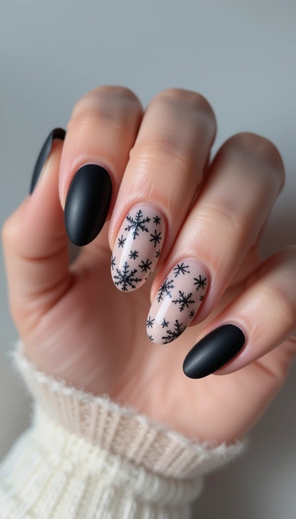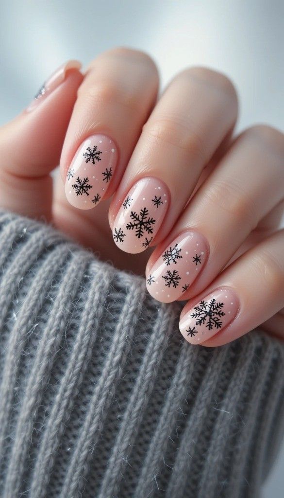 Soft nude nails feature delicate black snowflakes, paired with tiny white dots for extra sparkle. The glossy finish enhances the clean lines and festive charm.
