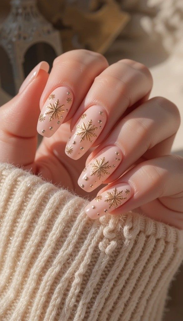Soft pink nails feature large gold snowflakes, paired with tiny rhinestones for extra sparkle. The glossy finish enhances the luxe, jeweled feel.