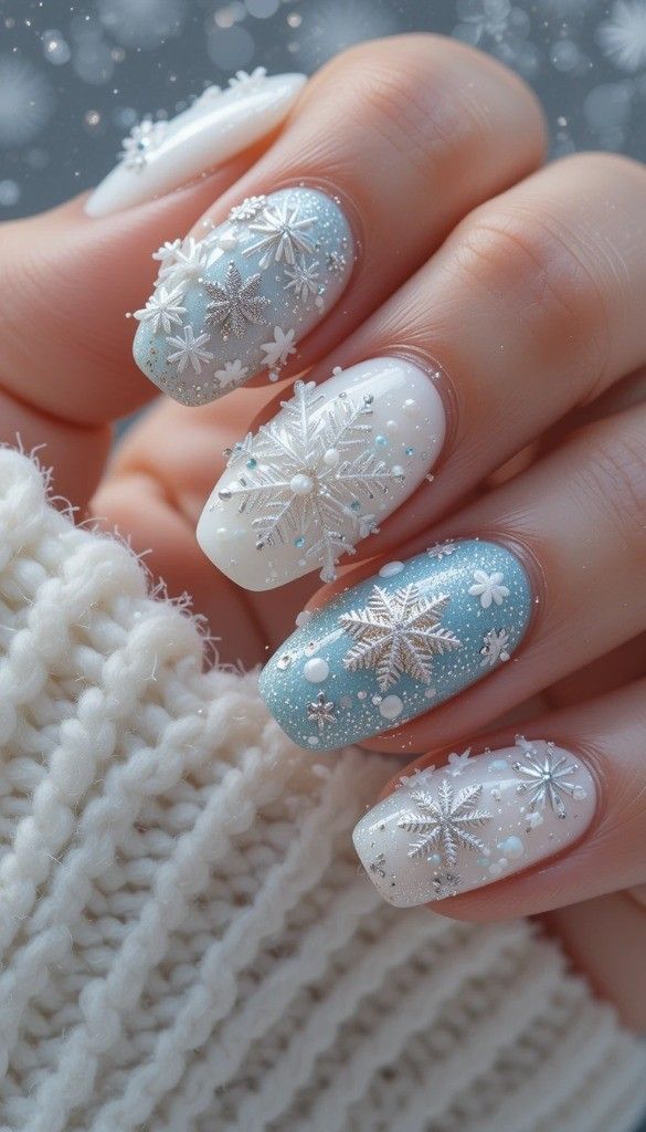 A mix of iridescent blue and white nails features 3D snowflakes, glitter, and tiny pearls. The frosty design adds a magical, ethereal glow to the almond shape.
