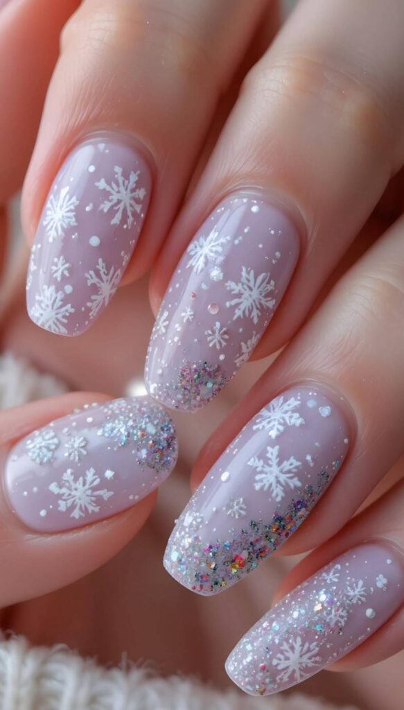 Soft lavender nails feature large white snowflakes, paired with one accent nail showcasing a glittery silver base. The glossy finish enhances the dimensional elements and festive energy.