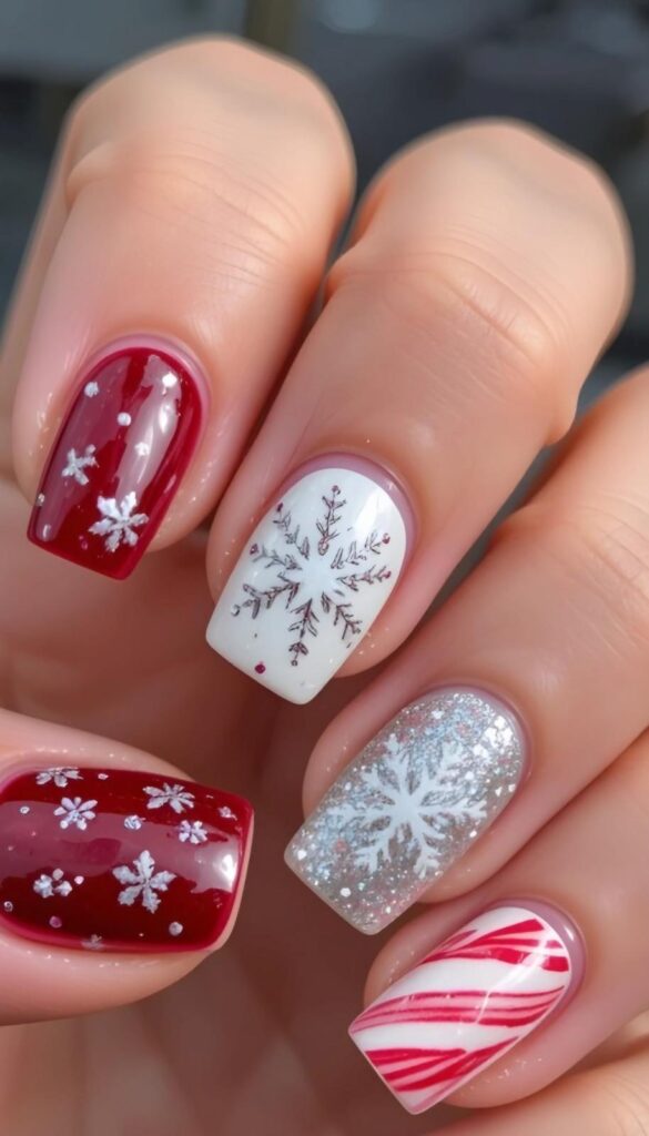 Rich red nails feature large white snowflakes, paired with one accent nail showcasing bold white candy cane stripes. The glossy finish enhances the clean lines and festive energy.