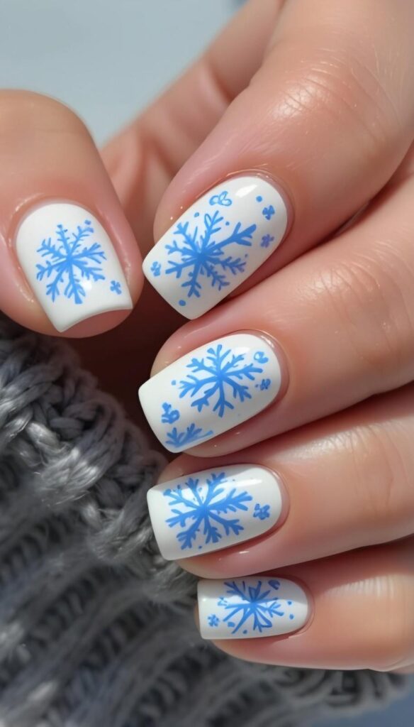 Crisp white nails host large blue snowflakes, creating a clean, elegant look. The glossy finish enhances the dimensional elements and festive energy.
