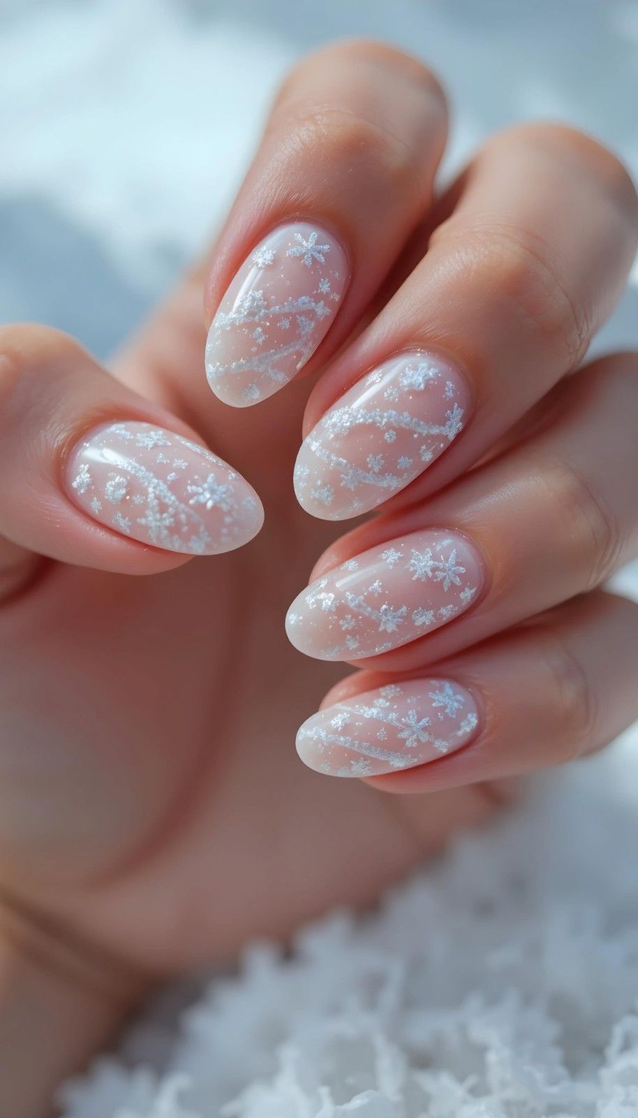 Soft nude nails feature delicate silver snowflakes, paired with tiny white dots for extra sparkle. The glossy finish enhances the clean lines and festive charm.