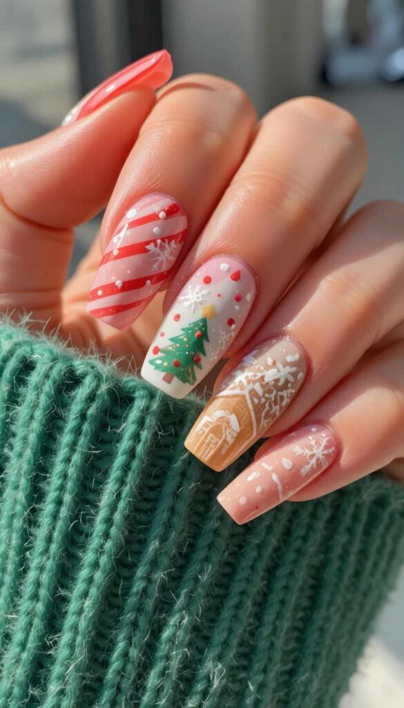 A mix of nude, red, and green nails features snowflakes, candy cane stripes, and a Christmas tree. The playful design adds a cheerful, holiday-ready vibe to the stiletto shape.