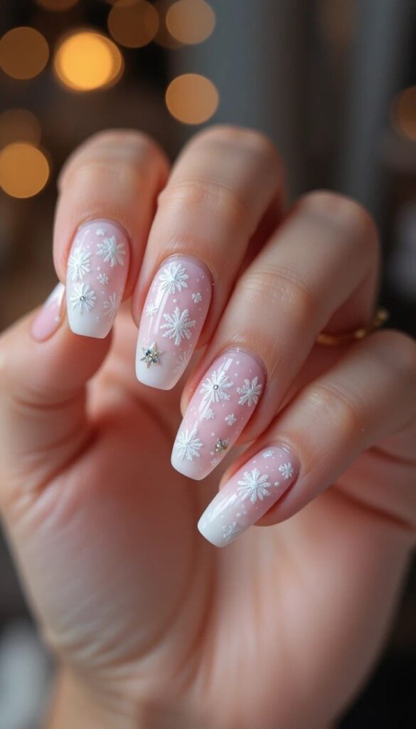 Soft pink nails feature large white snowflakes, paired with tiny rhinestones for extra sparkle. The glossy finish enhances the luxe, jeweled feel.