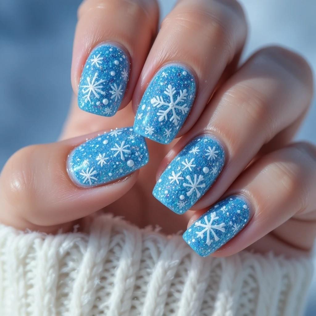 Rich blue glitter nails feature large white snowflakes, creating a clean, elegant look. The glossy finish enhances the dimensional elements and festive energy.