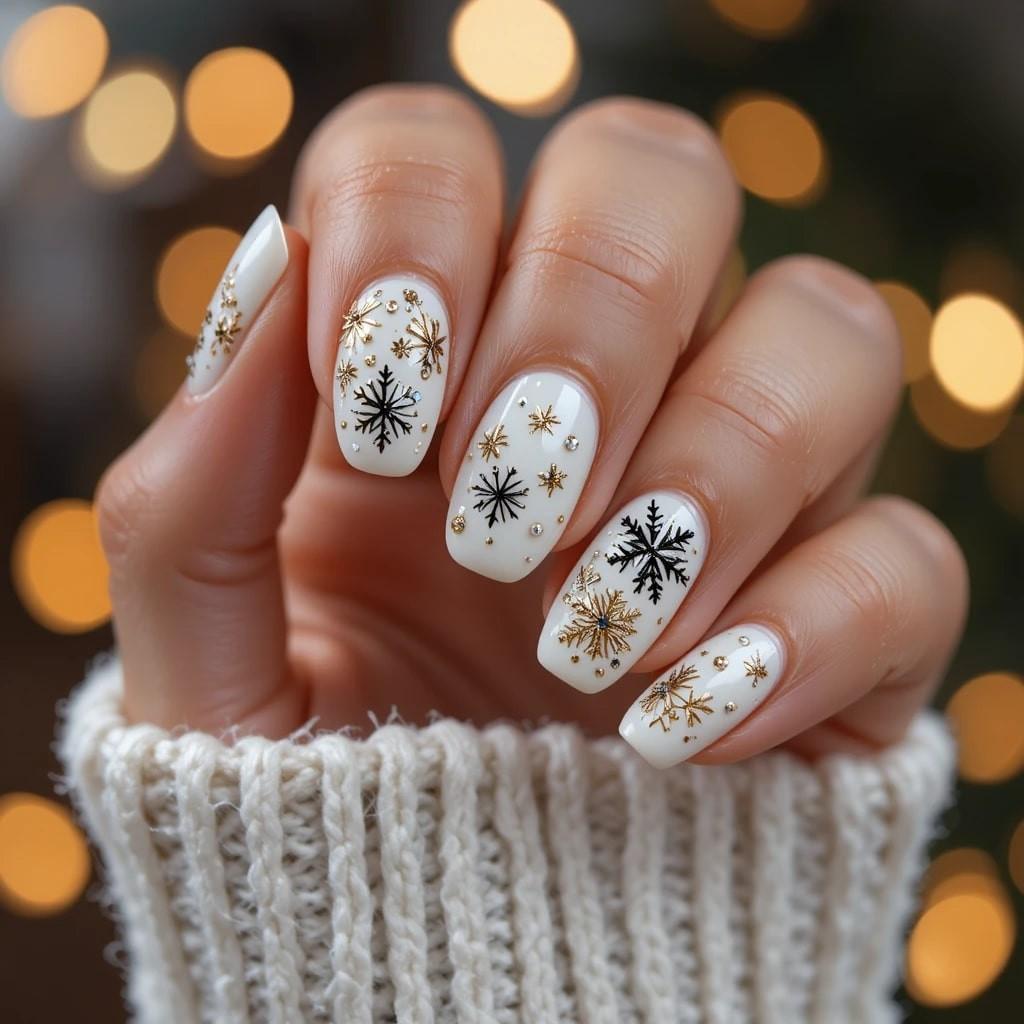 Crisp white nails host large gold and black snowflakes, paired with tiny rhinestones for extra sparkle. The glossy finish enhances the luxe, jeweled feel.