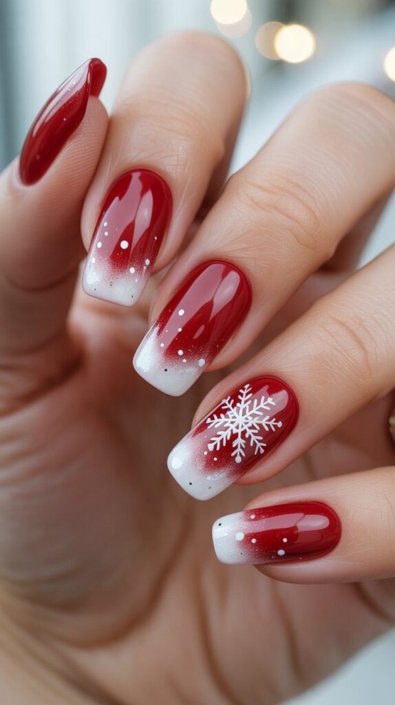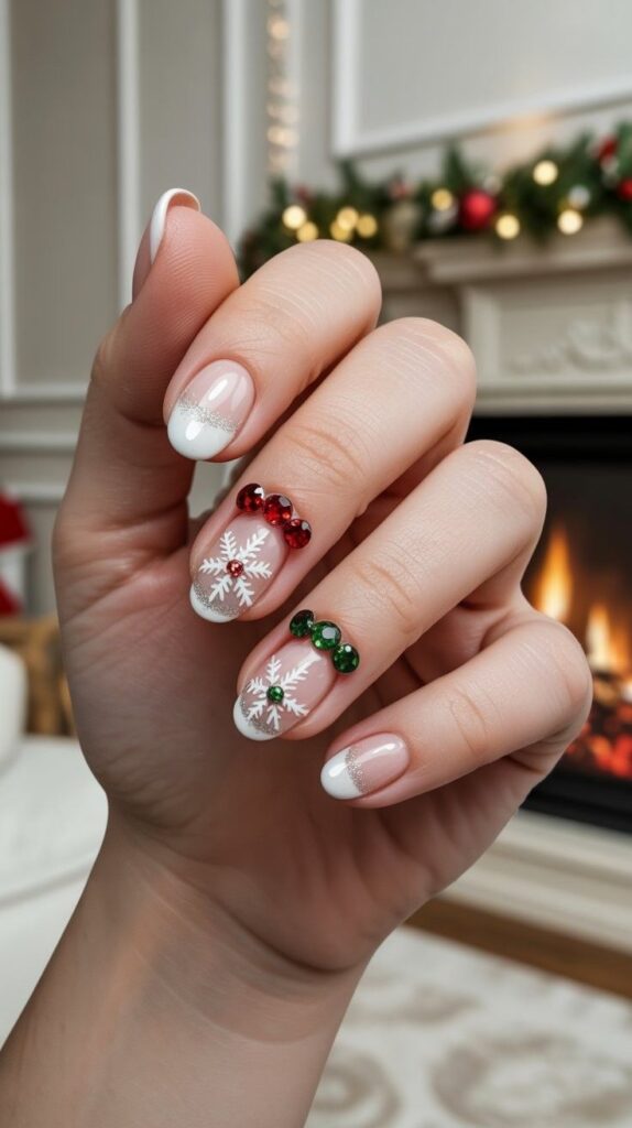 “Rich pink glitter coats four accent nails like holiday confetti, while the ring finger steals the show with a glossy white-and-pink candy cane swirl. Another nail features a giant white snowflake — bold, sparkly, and totally Instagram-worthy.”