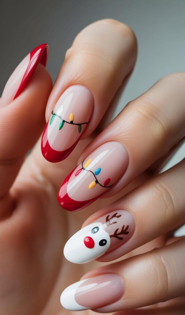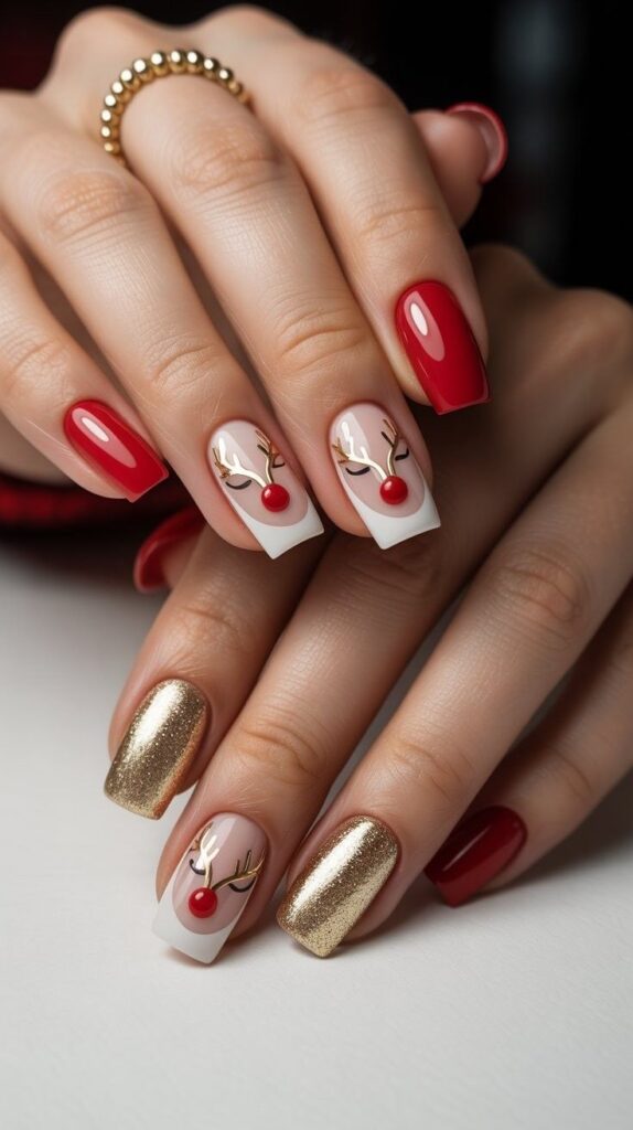 “Vibrant red glitter sets the stage for a whimsical holly leaf on one nail — complete with gold accents and tiny berries. The rest? Sprinkled with snowflakes and holly leaves — like a mini Christmas village living on your fingertips.”
