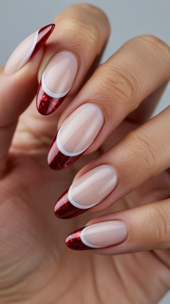 Forget basic red-and-green polish: these 25 Winter French designs are all about high-shine glamour, holiday whimsy, and that just-pulled-on-my-favorite-holiday-sweater vibe. Think candy cane swirls, reindeer faces, velvet red snowflakes, and galaxy ombres that look like they’ve been stitched onto your nails with pure holiday love.