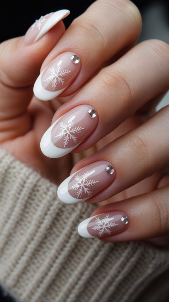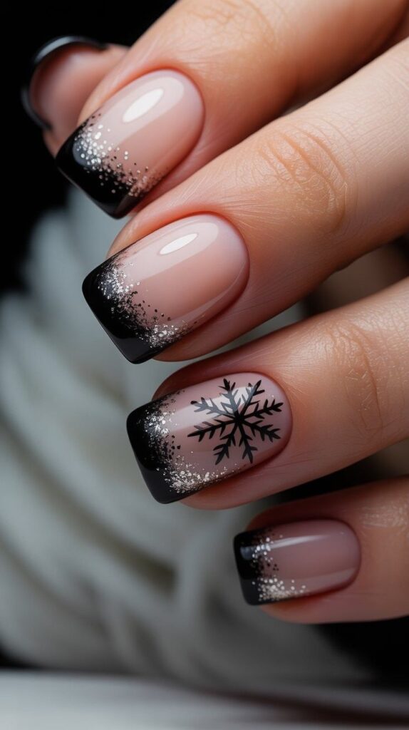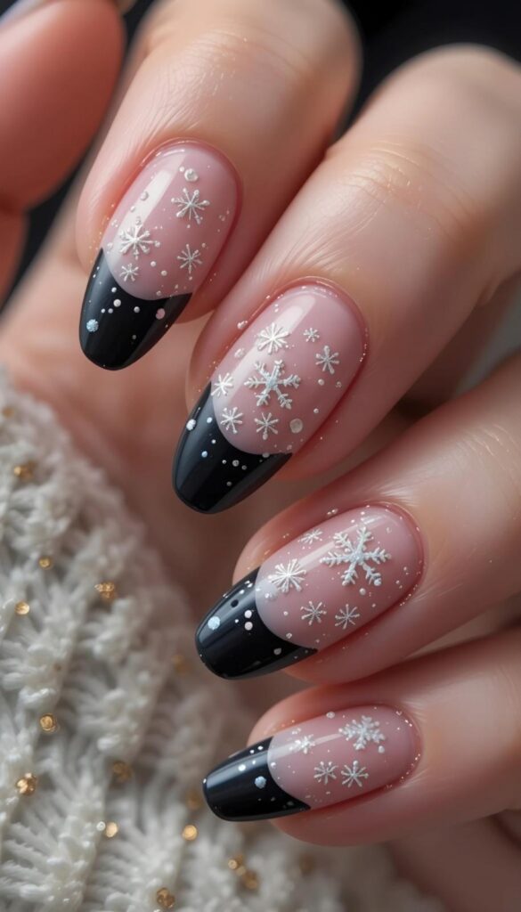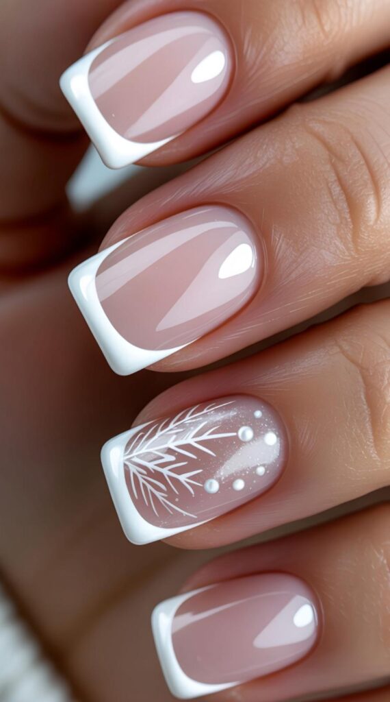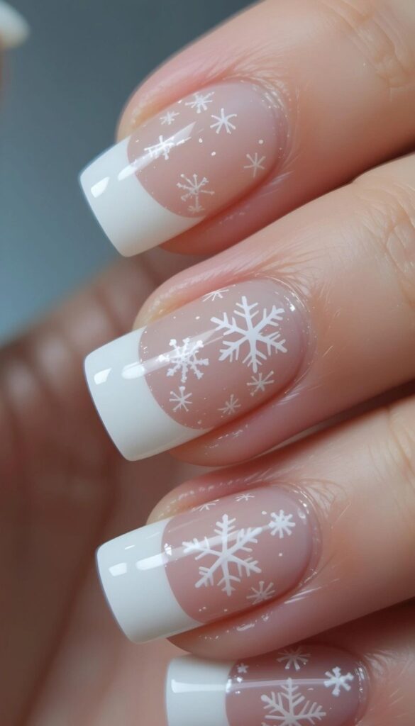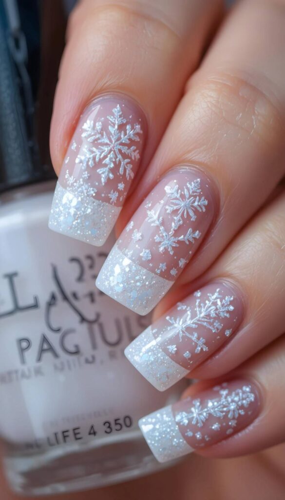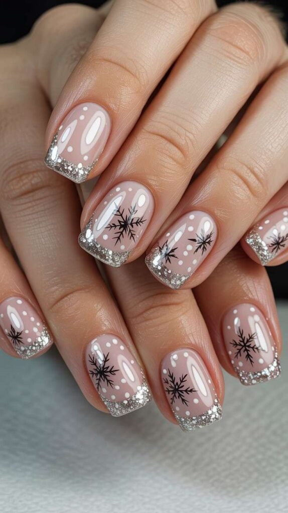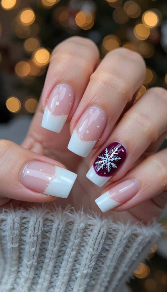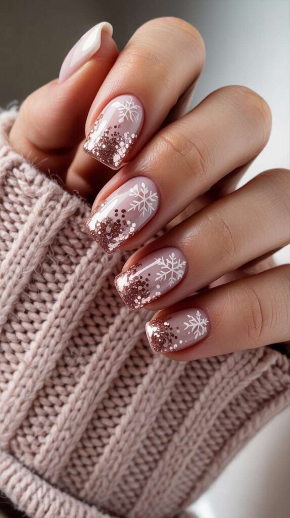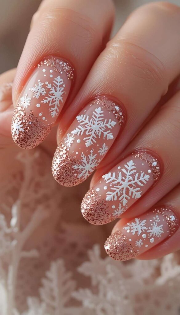 “Soft blush pink gel polish frames two accent nails — one with a giant white snowflake, the other a crisp white canvas with a gold glitter fade. The remaining nails? Speckled with snowy white dots for that ‘just walked through a winter wonderland’ feel — elegant, whimsical, and totally photo-ready.”