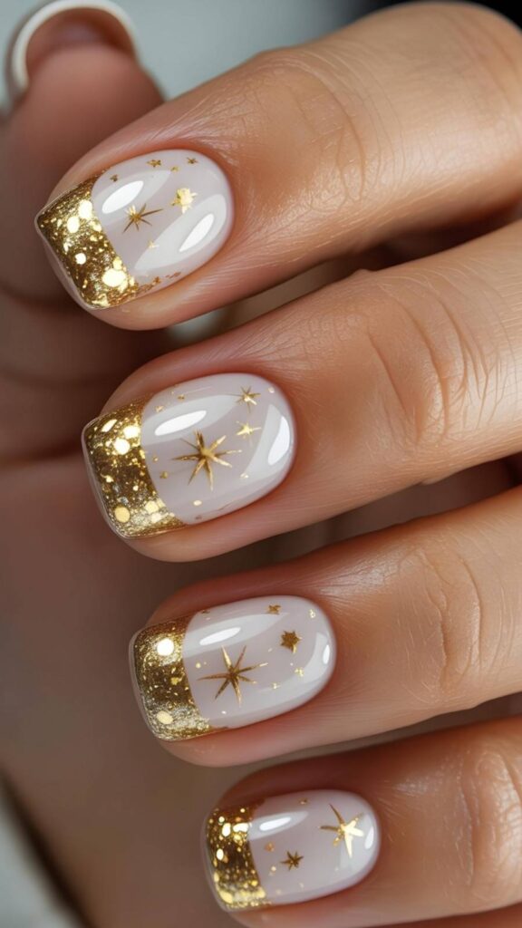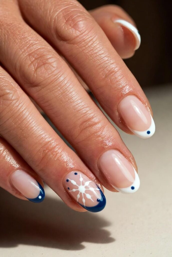 “Soft blush pink gel polish frames two accent nails — one with a giant white snowflake, the other a crisp white canvas with a gold glitter fade. The remaining nails? Speckled with snowy white dots for that ‘just walked through a winter wonderland’ feel — sweet, serene, and totally wearable.”