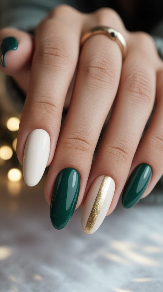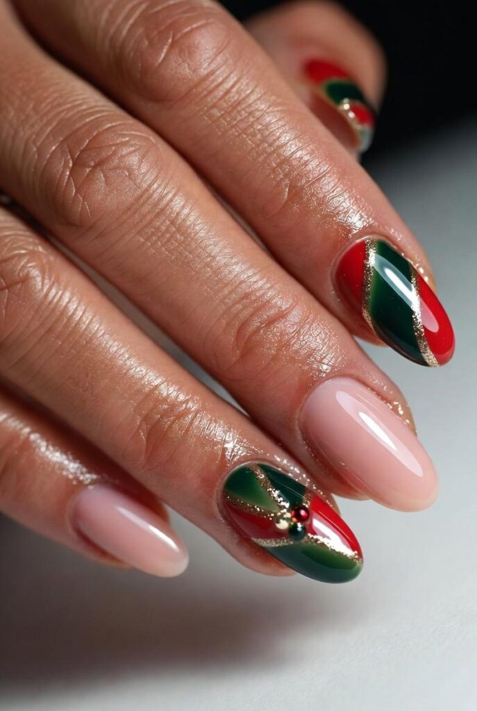 This design features a sophisticated almond shape with a soft, glossy nude base on most nails, creating a clean canvas for two bold accent nails. These accents showcase a dynamic, geometric pattern of deep emerald green and vibrant red, separated by delicate gold leaf lines that add a touch of luxury. Tiny red and green rhinestones are placed at the intersection of the colors, mimicking festive ornaments. The high-gloss finish unifies the look, making it feel polished and intentionally modern.