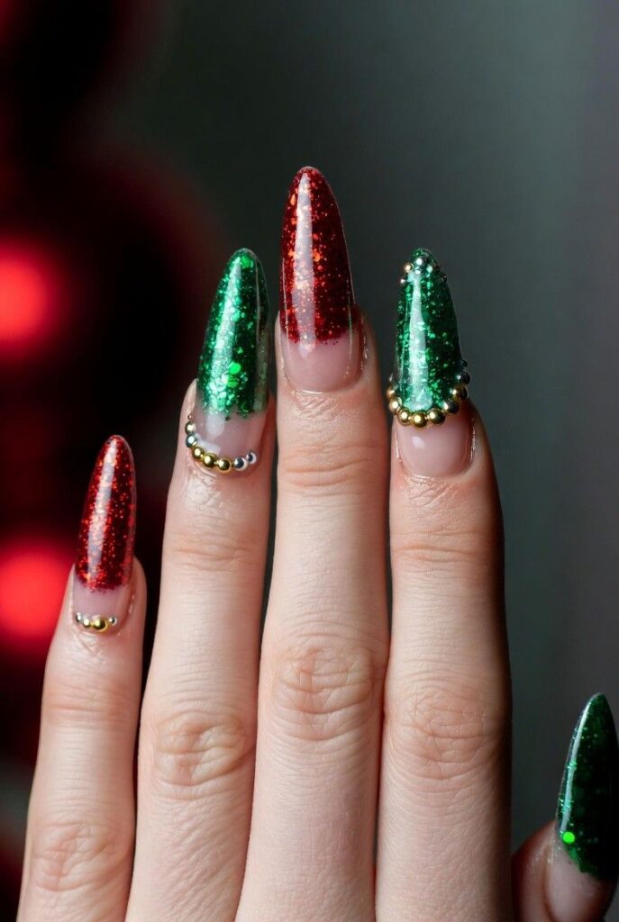 6) Glittery Red & Green Tips with Gold Beads