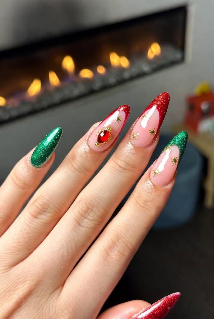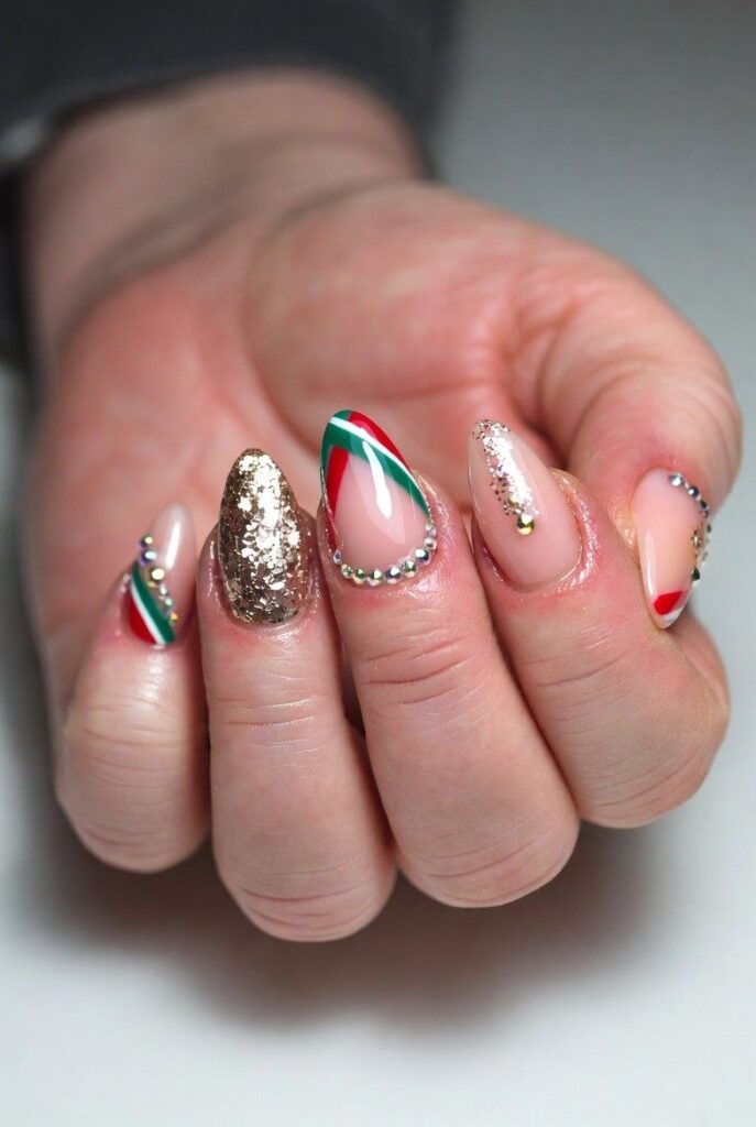 Soft nude nails feature bold red and green glitter tips, paired with one accent nail showcasing rhinestones for extra sparkle. The glossy finish enhances the dimensional elements and festive energy.