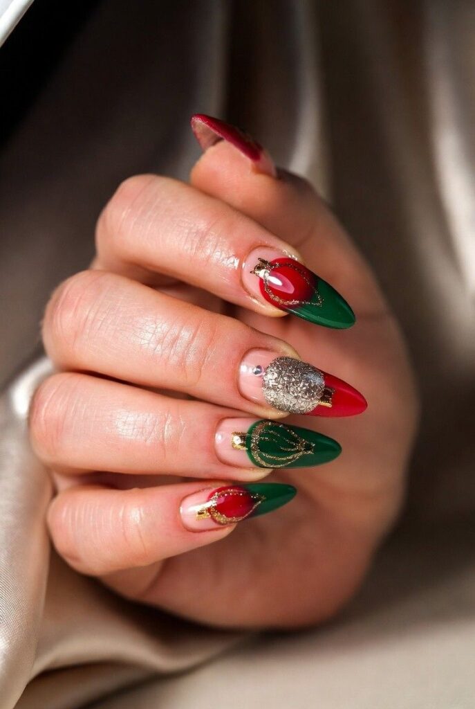 22) Festive Red & Green Geometric Almond Nails