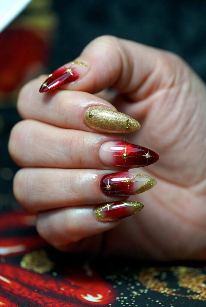 9) Glittery Red & Gold Tips with Stars