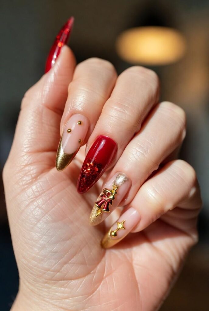 Soft nude nails feature bold red and green glitter tips, paired with one accent nail showcasing gold beads for extra sparkle. The glossy finish enhances the dimensional elements and festive energy.