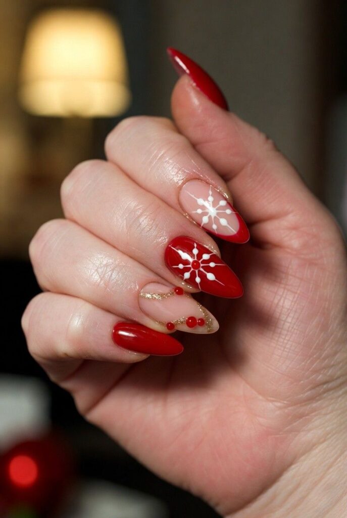 Rich red nails feature large white snowflakes, paired with one accent nail showcasing a glittery gold base for extra sparkle. The glossy finish enhances the dimensional elements and festive energy.