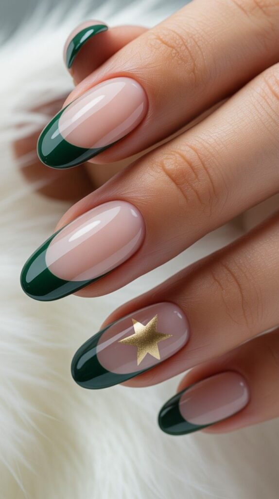 Rich green nails feature a large gold star, creating a clean, elegant look. The glossy finish enhances the dimensional elements and festive energy.