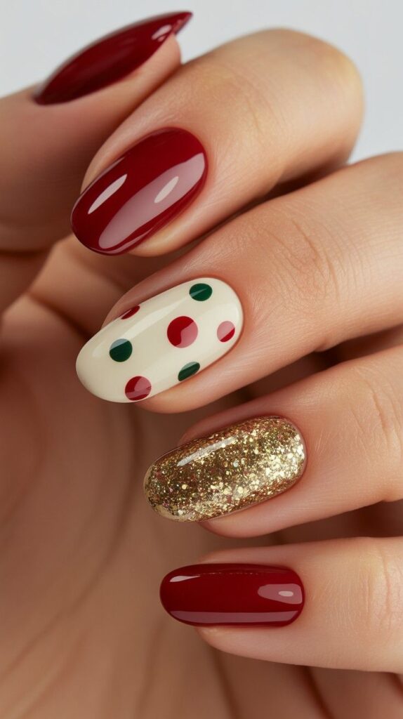 Soft pink nails feature red and green polka dots, paired with one accent nail showcasing a glittery gold base. The glossy finish enhances the playful, candy-inspired feel.