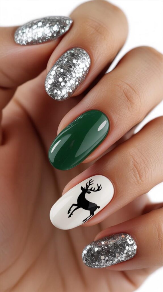 Rich green nails feature a black reindeer silhouette, paired with one accent nail showcasing a glittery silver base. The glossy finish enhances the dimensional elements and festive energy.